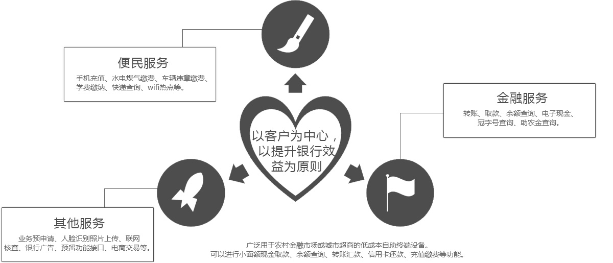 為幫助解決銀行業(yè)面臨的互聯(lián)網(wǎng)金融、金融脫媒、利率市場(chǎng)化、行業(yè)競(jìng)爭(zhēng)加劇、成本高、盈利下降等挑戰(zhàn),同時(shí)響應(yīng)國(guó)家助農(nóng)政策號(hào)召。 我司研發(fā)一款專門針對(duì)農(nóng)村金融市場(chǎng)或商超等特定場(chǎng)景而開發(fā)的可以查詢,轉(zhuǎn)賬,取現(xiàn),收單、信用卡還款,手機(jī)話費(fèi)充值等,同時(shí)可疊加本地特色業(yè)務(wù)(水、電、煤代繳、助農(nóng)補(bǔ)貼、社保等)的柜立式金融便民終端。終端可解決銀行ATM機(jī)網(wǎng)點(diǎn)固定、單一且投放量不足的問題。整機(jī)總體高度約140cm,外觀設(shè)計(jì)符合人體工程學(xué),操作舒適